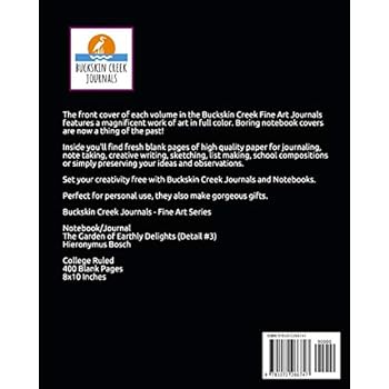 The front cover of each volume in the Buckskin Creek Fine Art Journals features a magnificent work of art in full color. Boring notebook covers are now a thing of the past!Inside you'll find fresh blank pages of high quality paper for journaling, note taking, creative writing, sketching, list making, school compositions or simply preserving your ideas and observations. Set your creativity free with Buckskin Creek Journals and Notebooks. Perfect for personal use, they also make gorgeous gifts. Buckskin Creek Journals - Fine Art SeriesNotebook/JournalThe Garden of Earthly Delights (Detail #3) Hieronymus Bosch